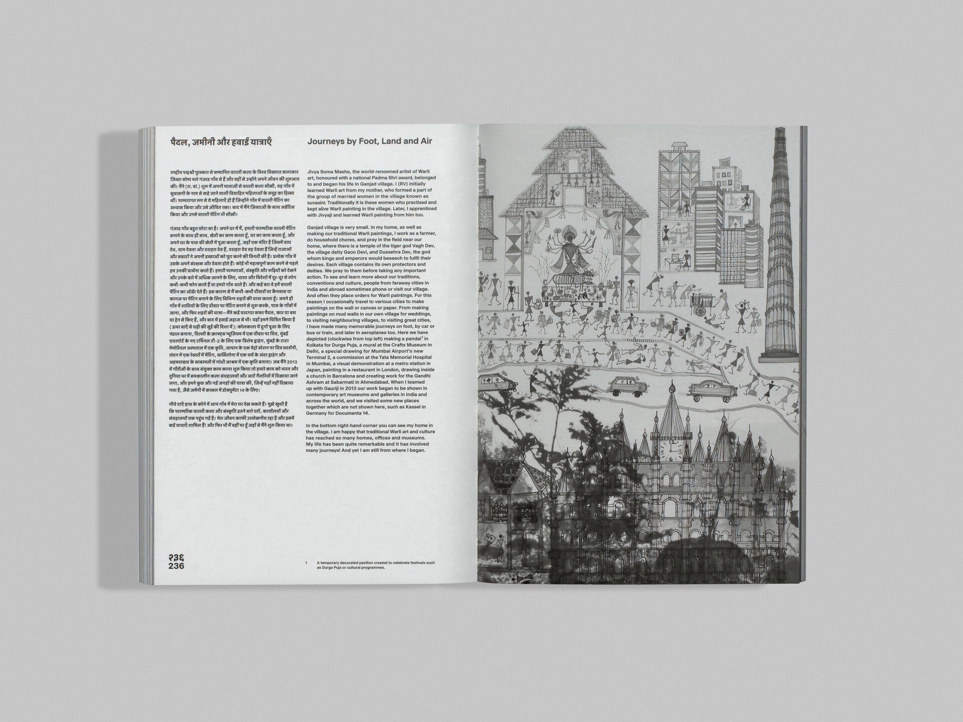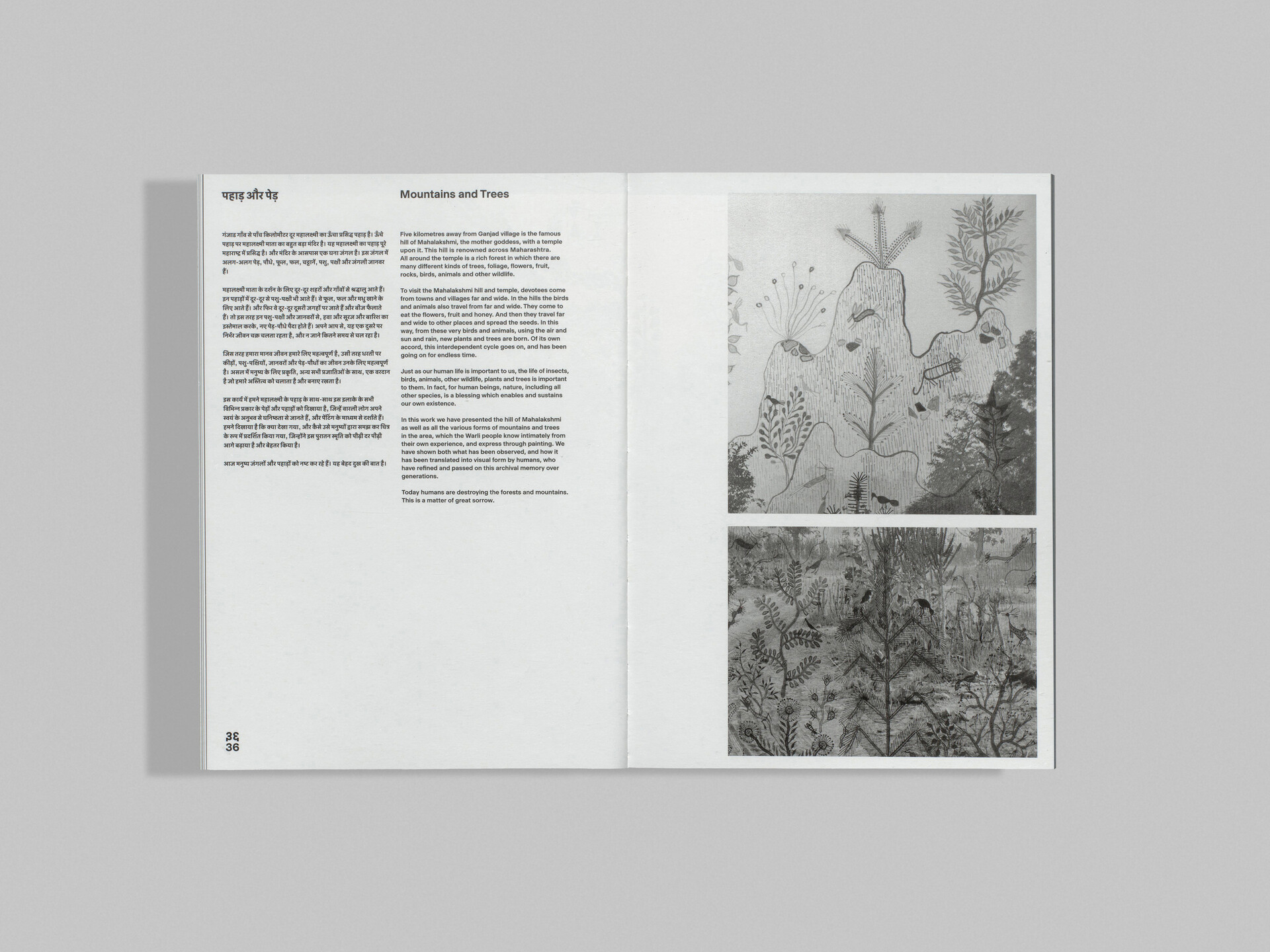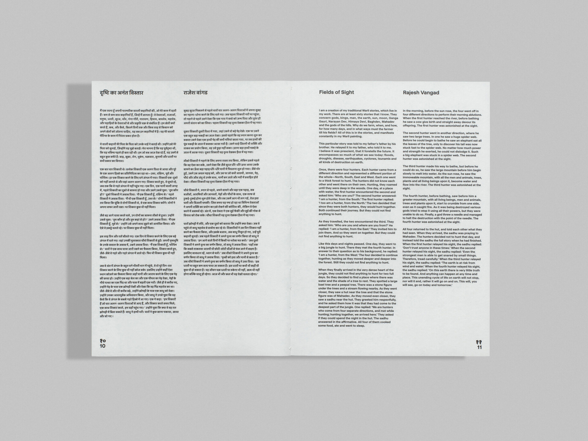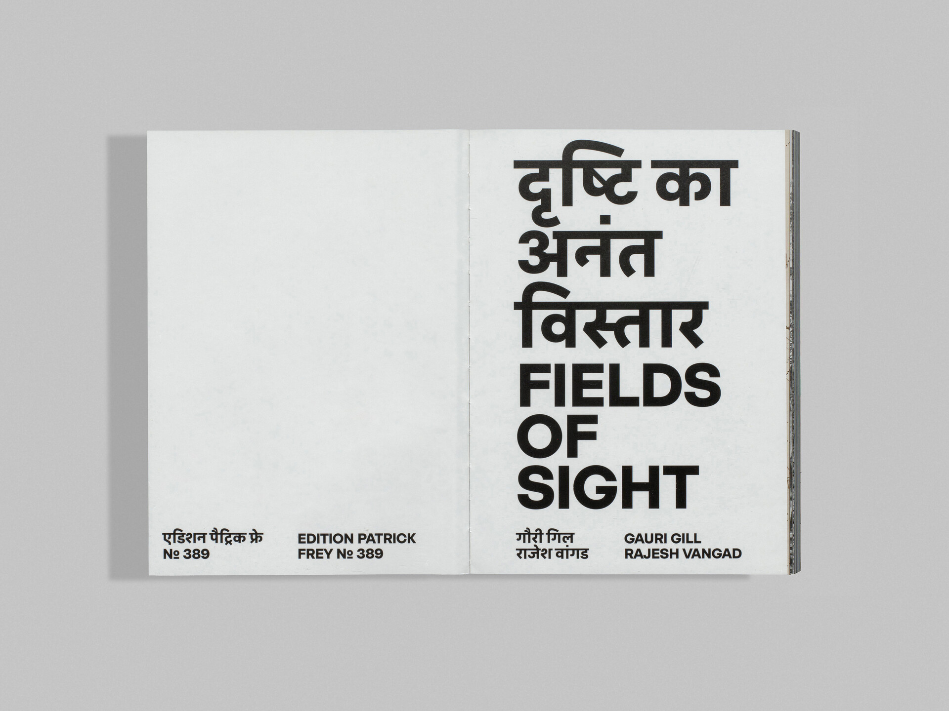 Fields of Sight ging aus der einzigartigen Zusammenarbeit der Fotografin Gauri Gill mit dem bekannten Warli-Künstler Rajesh Vangad hervor. Begonnen wurde sie Anfang 2013 in Ganjad, Dahanu, einem Adivasi-Dorf in der Küstenregion des indischen Bundesstaats Maharashtra. Aus Gills ersten Erfahrungen mit der Landschaftsfotografie entwickelte sich in einer Art Symbiose eine neue visuelle Sprache. Bei der Durchsicht ihrer Kontaktbögen bemerkte sie, dass wichtige Aspekte fehlten, obwohl die Kamera die «chamäleonartige» Haut der Landschaft eingefangen hatte – Aspekte von etwas, was das Auge nicht wahrgenommen hatte, aber in den grossartigen mythologischen und experimentellen Geschichten, die ihr Vangad vorlas, sehr lebendig beschrieben war. Die mit Vangads Zeichnungen überschriebenen Fotografien Gills rekonfigurieren den fotografischen Ort sowohl formal wie konzeptuell, um neue Dokumente mit nicht nur einer Wahrheit und einem transaktiven Wissenssystem zu erhalten. Die Landschaften durch Vangads Augen zu sehen erweckte in Gill das Bedürfnis, unsere heutige Wahrnehmung von dem, was unsere Augen einfangen und was ihnen möglicherweise auch entgeht, zu hinterfragen. «Als würde man ein altes Haus fotografieren, aus dem im selben Moment ein:e Bewohner:in herauskommt und zu reden anfängt.»