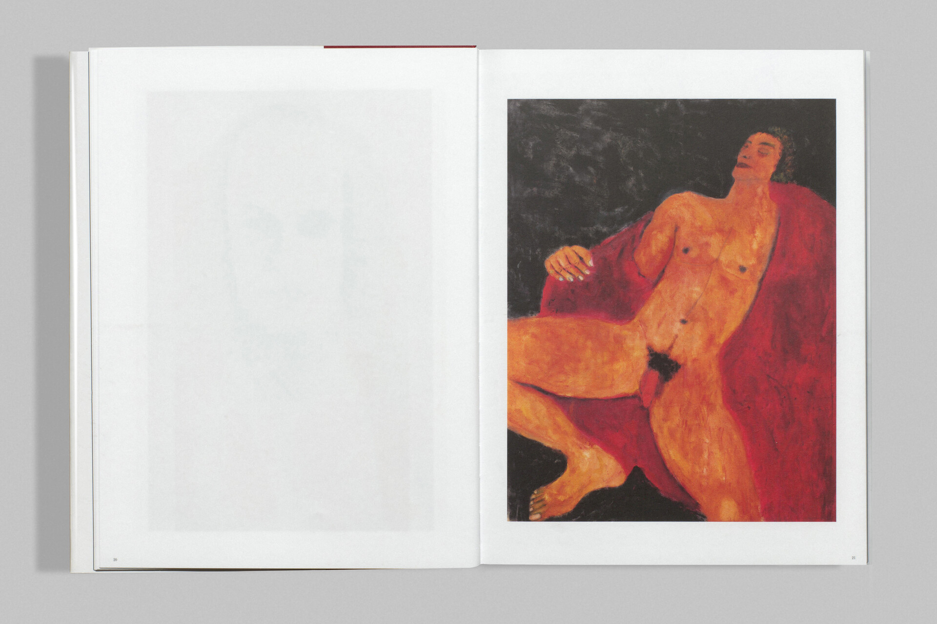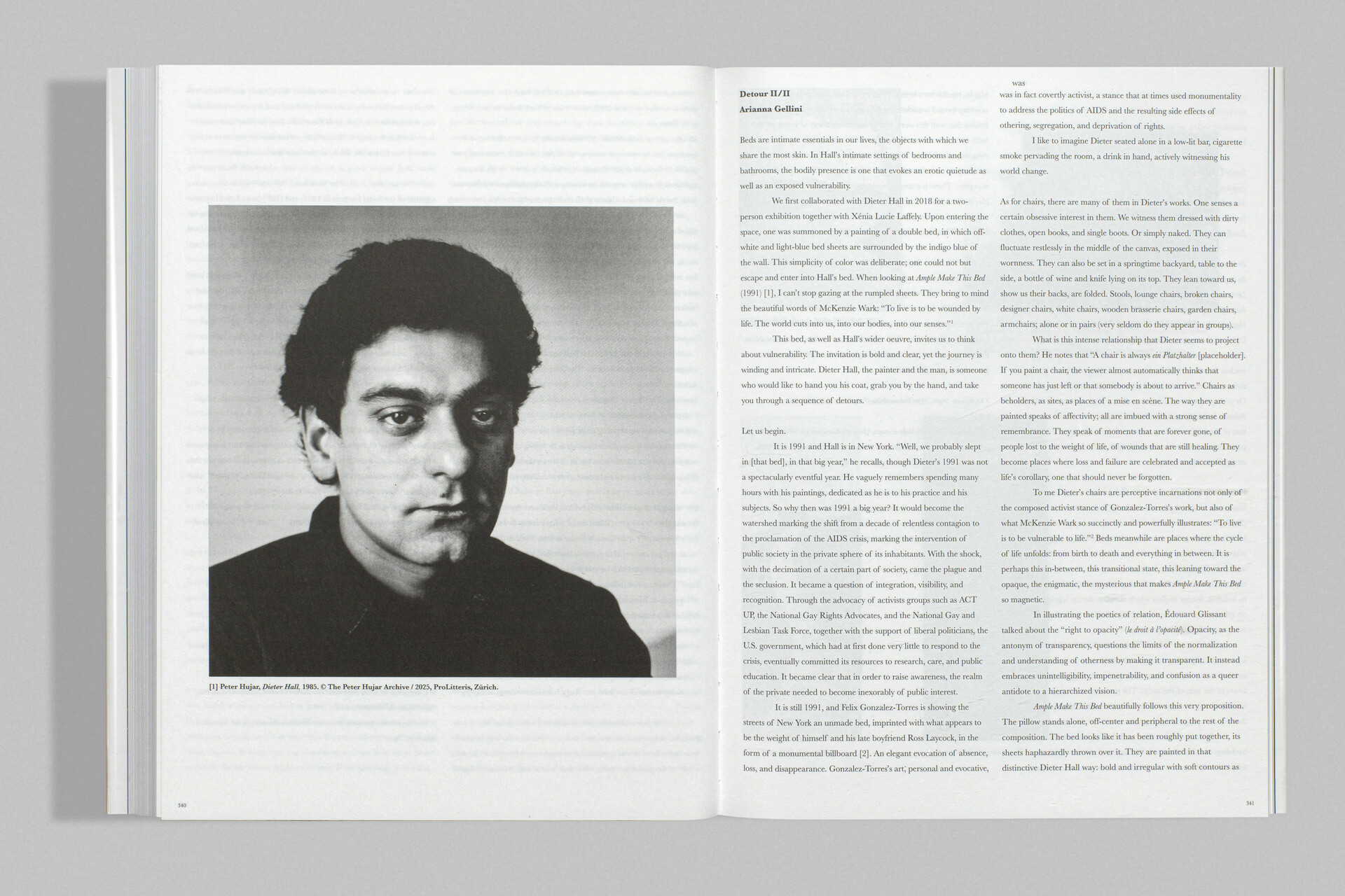 Dieter Hall porträtiert den auf sich zurückgeworfenen Menschen, Ecce Homo. Ohne soziale Attribute, oft nackt, gleichsam in splendid isolation sucht er im Körperbild des anderen – meist Männer – das Gemeinsame des blossen Daseins: A Naked Chair, so der Titel der Publikation. Mit demselben Blick schaut er auf Dinge, Gegenstände, Gärten oder Landschaften. Seine Stillleben erinnernd an Bonnard und Matisse – ein Blick auf ein Glas, eine Blume, einen StuhI –, sind immer arrangiert. Immer wieder Stühle, leer und stellvertretend, sie wirken oft wie ein stilles Echo der Isolation und der Vergänglichkeit, verstärkt durch den dunklen Schatten der Aids-Epidemie, der sich in Halls New Yorker Zeit über sein Leben und Werk legte. Nicht im klassischen Sinne referenziell, reagiert Hall doch auf die Werke anderer Kunstschaffenden, darunter die für ihren psychologischen Realismus geschätzte Malerin Alice Neel oder Fotografen wie David Armstrong und Peter Hujar. Mit Letzterem war er befreundet, verkehrte in derselben Szene – bis zu dessen frühem Tod an Aids. Fotografie nimmt in Halls Werk eine zentrale Rolle ein – jedoch niemals als Selbstzweck. Sie hilft ihm vielmehr bei der Bildkomposition. So wählt er Details aus – einen Fuss, eine Hand –, die er ins Malerische übersetzt, wobei eine völlige Neuerfindung der dargestellten Person stattfindet. Von Isolation wie von einem tiefen Bedürfnis nach Verbindung erzählend, zeichnen sich die Werke besonders durch eines aus: radikale Intimität.