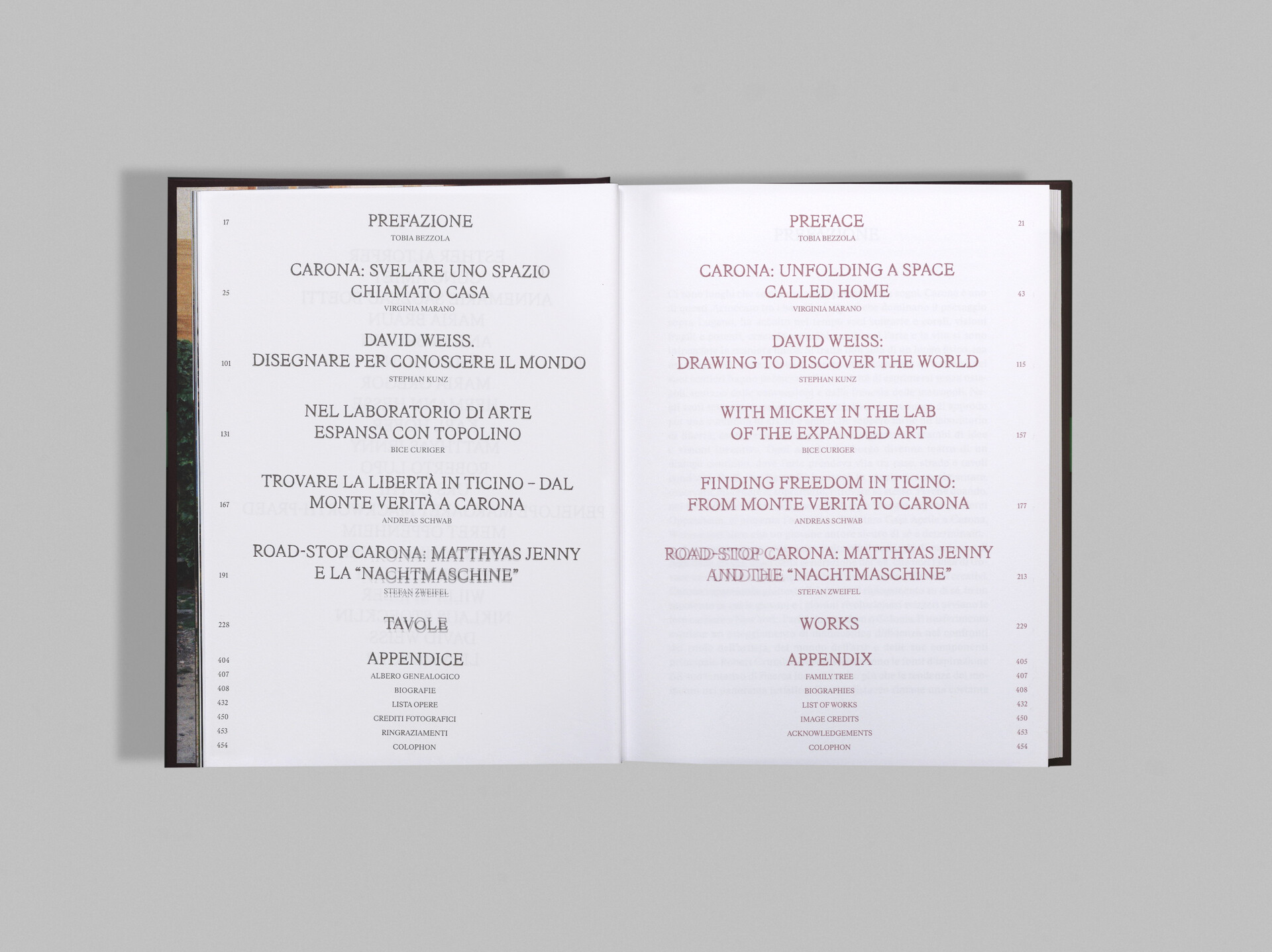 With texts by Bice Curiger, Stephan Kunz, Virginia Marano, Andreas Schwab, and Stefan Zweifel, and a preface by Tobia Bezzola. Co-published with MASI Lugano in conjunction with the exhibition David Weiss. The Dream of Casa Aprile: Carona 1968–1978 (Sept 28, 2025–Feb 1, 2026). This publication is available in an Italian/German and an Italian/English edition.